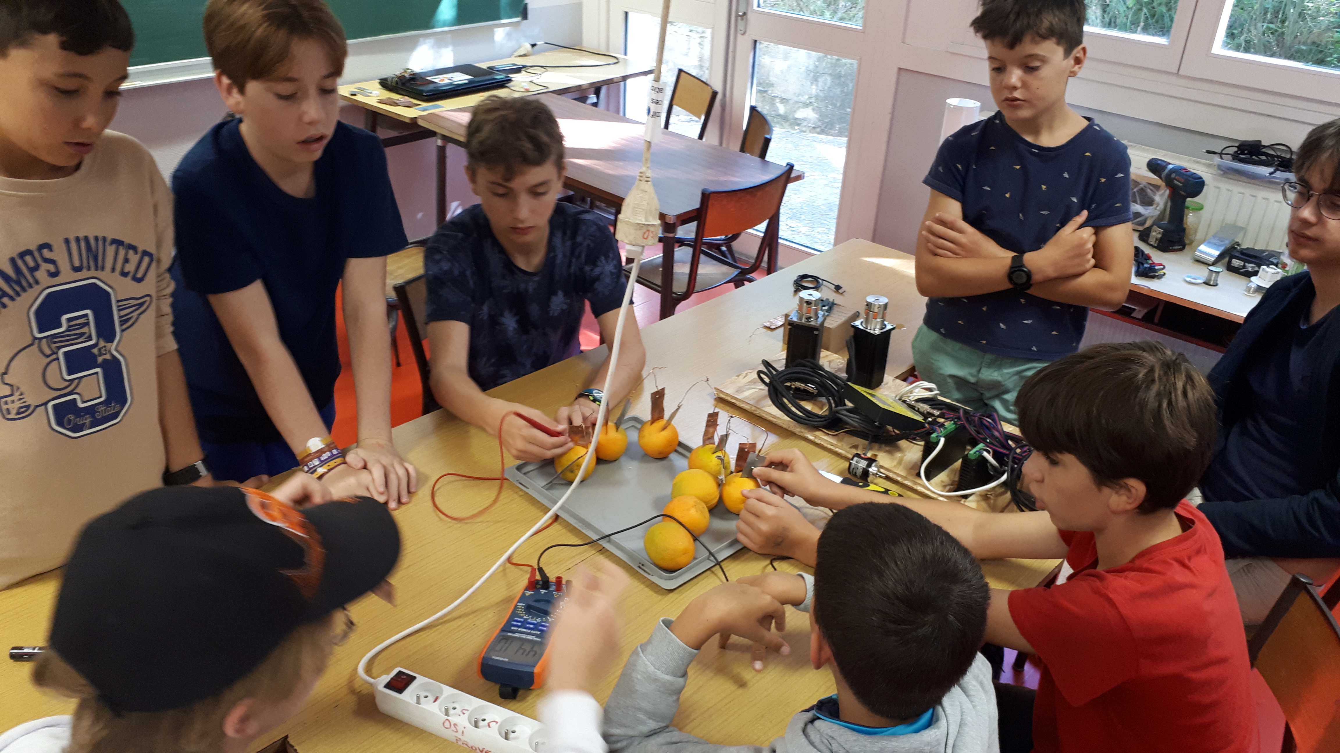 La matinée a commencé avec un essai d’alimentation d’un montage électronique, à partir des « piles à oranges ».